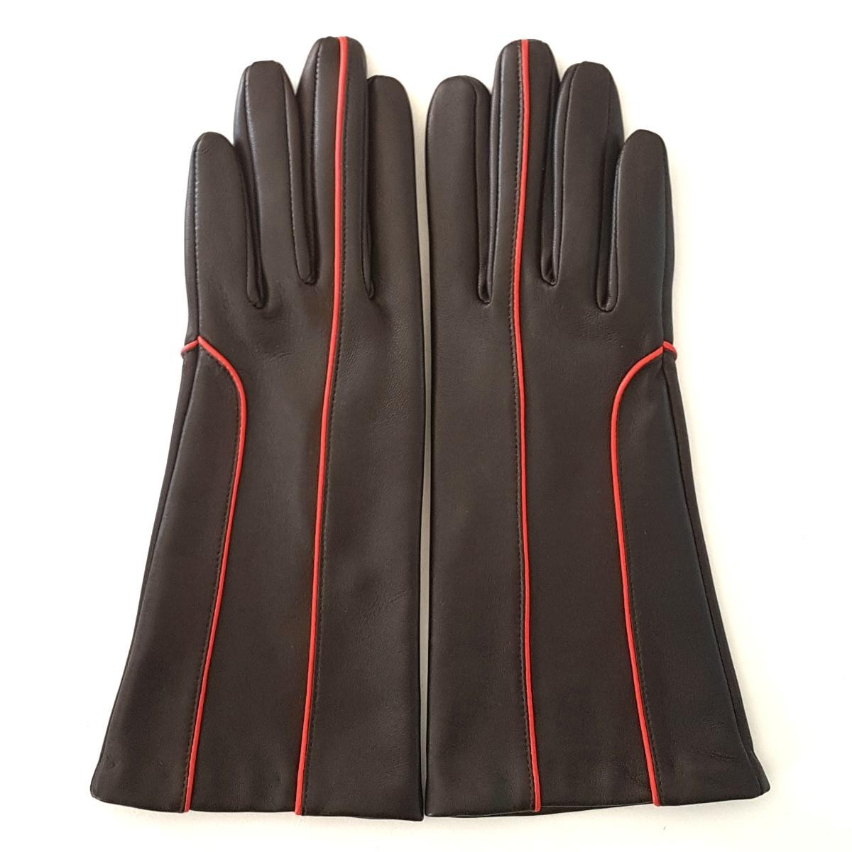 Paire de gants en cuir femme fantaisies, mi-longs, couleur marron et orange, cuir d'agneau véritable. Peausserie en agneau très souple, de qualité supérieure. Fantaisies de la ganterie André POUJADE, à la coupe élégante et confortable. Les gants Aïna sont cousus machine, doublés de soie, qui apporte une chaleur supplémentaire.
