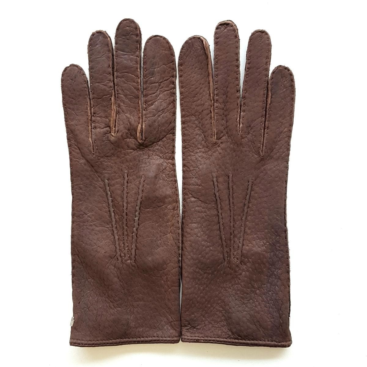 To maintain the beauty of the peccary leather, gently hand wash the gloves in cold water with mild soap, such as Marseille soap. Rinse carefully and lay flat to dry, away from direct heat sources.