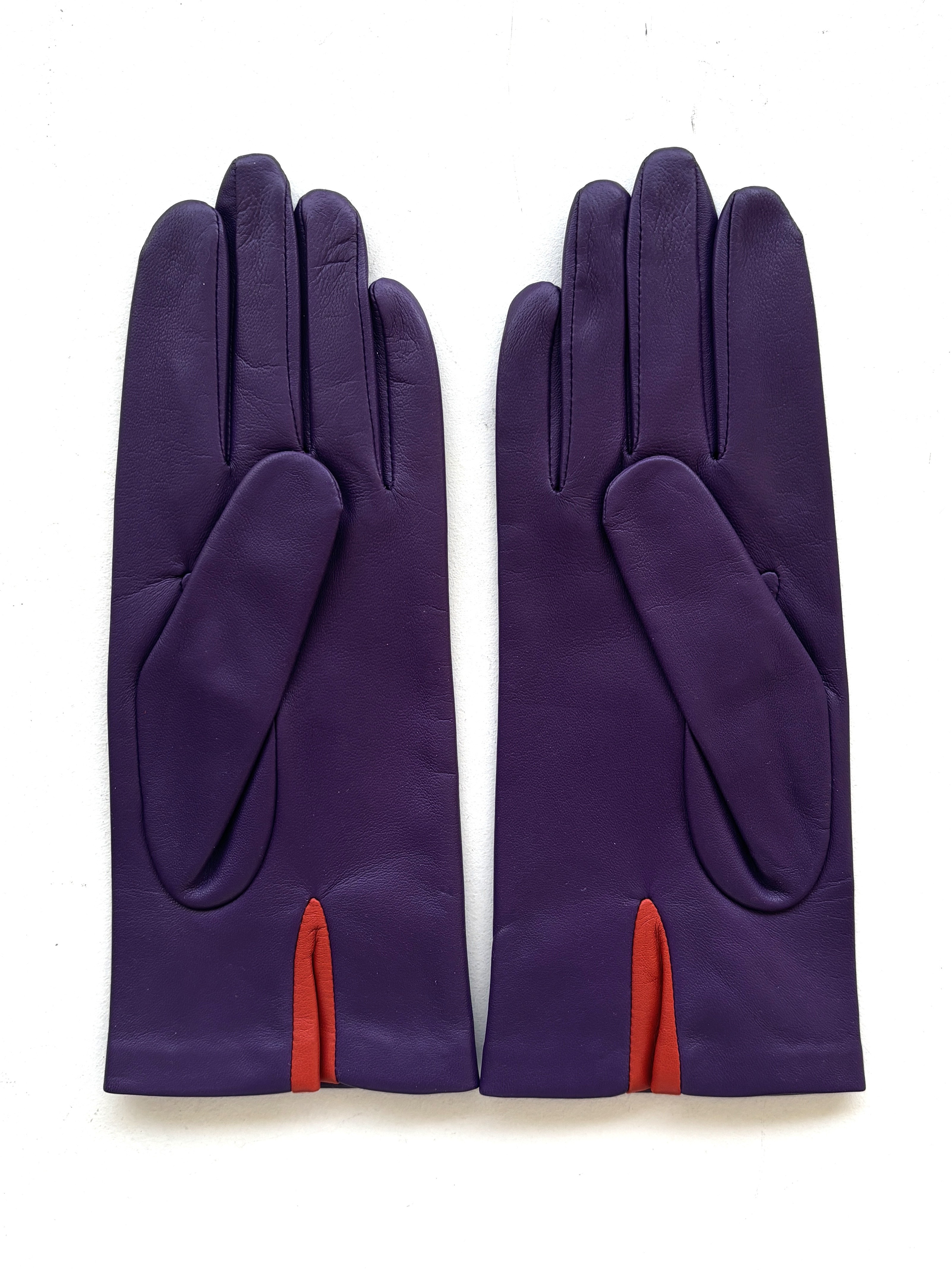 Gants femme ROSA en cuir d’agneau souple – Fantaisie fleur – Améthyste & Orange
